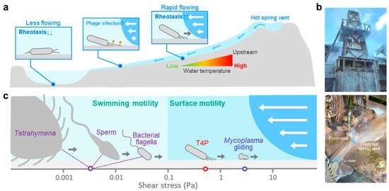 Rheotaxis of T. thermophilus in natural habitats. (a) Rheotaxis may have a role in flowing environments at hot spring vents. Low and rapid water flows may navigate cells to stay at (left) or move toward high temperature zones (right), respectively. The presence of T4P may facilitate infection by phages. (b) Symbolic building in the Mine Onsen hot spring (top). Hot spring water is drawn up from the source and used in baths and other facilities. The drawn hot spring water mixes with well water and some of it flows into the river (bottom). (c) Shear stress and rheotaxis in microorganisms, sperm cells, bacterial flagella, pili, and Mycoplasma gliding.