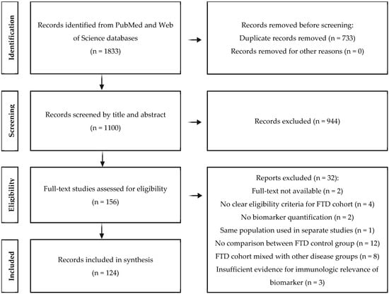 Only original, full-text articles in English were included in this review. Eligible studies quantified immunological biomarker levels in CSF or blood samples from live FTD patients and compared them to those from healthy individuals or neurological controls, including patients with any neurological disease. Comparisons among FTD subtypes were also included. Studies on markers with uncertain immunological relevance were eligible if at least three independent publications have demonstrated their direct effect on established immunological components. Postmortem and animal studies were excluded, as were reviews, case reports, scientific notes, abstracts, and duplicates.