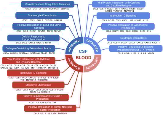 Enriched immunological pathways in FTD. The enrichment analysis was conducted on immunological markers with significantly altered levels in FTD patients compared to healthy controls. Each selected pathway required a minimum of 5 biomarkers and had to meet an adjusted significance threshold of 0.05. Broad, non-specific immune pathways were excluded. The top 5 pathways, ranked by adjusted significance levels, are shown for immune markers with increased and decreased levels in CSF, as well as increased levels in blood. No pathways were identified for markers with reduced levels in blood when using the stated selection criteria. Biomarkers belonging to each enriched pathway are shown below it.