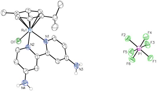 Preparation of the Ru complexes was achieved following the mixing of a Ru(II)–arene dimer with the desired 2,2-bipyridne (bpy) ligands. The subsequent addition of ammonium hexafluorophosphate afforded the desired complex ions. The hexafluorophosphate salts of RuB, RuBMe, and RuBtB have been reported previously [30,31,32], along with the chloride salts of RuBMeO and RuBA [33,34]. To confirm successful preparation of the complexes, an analysis by 1H and 13C NMR was performed, while yields similar to those of the previous reports were obtained. Fortunately, single crystals suitable for X-ray diffraction were obtained for RuBA, and its structure was solved (Figure 3). The observed molecular structure was the anticipated three-legged “piano stool” arrangement with a pseudo-octahedral geometry. The measured bond lengths to the facial ligands around the Ru metal center of Ru-Cl 2.409(9) Å, along with the bpy Ru-N 2.085(3) Å and 2.091(3) Å, were in good agreement with those of RuB and RuBMeO [33,35]. Hydrogen bonding interactions were observed between the free amine groups and the hexafluorophosphate anion within the unit cell (Table S2). Since studies of previous Ru-based anti-Aβ complexes identified a free amine group on the heterocyclic ligand as an important functional group for activity [10,11,12], the observation of such hydrogen-bonding interactions within the crystal structure was encouraging.