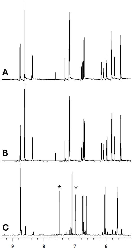 1H NMR spectra in 25% DMSO-D6 and D2O of complex RuBA. (A) RuBA with no incubation, (B) RuBA after 1 h of incubation at 37 °C, (C) imidazole and RuBA (1:1 molar ratio) after 1 h of incubation at 37 °C. The free imidazole peaks are marked with an asterisk (*).