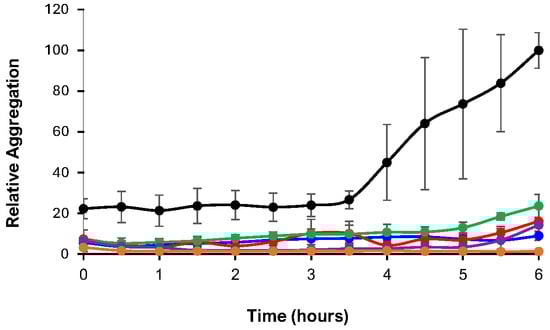 Samples were extracted from the ThT assay plate for DLS analysis. A 125 μL sample was placed into a 1 mL syringe and injected through a syringe filter (pore size: 0.2 μm), into a 0.5 mL microcentrifuge tube. The filtrate was added to a microvolume polystyrene cuvette and placed into a Malvern Zetasizer Nano ZSP to measure the DLS spectra. Measurements are represented as an average of percent intensity through several runs determined by Zetasizer software Version 7.13.1.