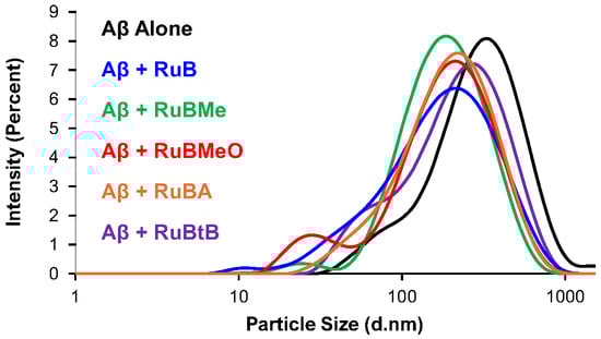 Samples for DLS analysis were taken directly from the ThT assay following its completion. This allowed for a comparison between both data sets, to determine if a correlation for activity between the complexes could be established. For the Aβ40 peptide alone, a prominent peak around 340 nm was observed, while following treatment with the respective Ru complexes, a discernable shift to smaller particle sizes was unanimously observed (Figure 6). For these prominent peaks, the smallest particle sizes were observed for RuBMe (214 nm), followed by RuB (227 nm), RuBA (231 nm), RuBMeO (239 nm), and RuBtB (264 nm).
