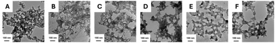 Samples for TEM were prepared using the DLS filtrates following their analysis. An aliquot (20 µL) was added directly to a copper-coated formvar/carbon 300 mesh grid with a 63 µm pore size (Ted Pella). After settling for 1 min, the solvent was wicked away, then the grid was stained using 2% uranyl acetate (20 µL). After standing for one minute, the solvent was wicked away, and the grid was washed using dH2O (20 µL), which stayed on the grid for one minute before being wicked away. The grids were stored at room temperature until analysis. TEM images were collected using a high-resolution JEOL JEM 2100F operating at 200 kV.