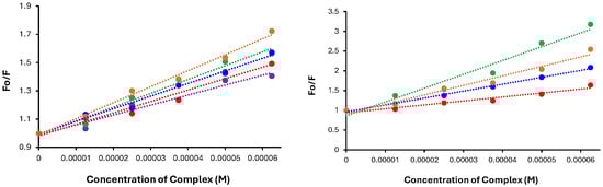 Stern–Volmer plots for the complexes after mixing them with HSA and DG (left) and WF (right). Blue = RuB, Green = RuBMe, Red = RuBMeO, Orange = RuBA, Purple = RuBtB.