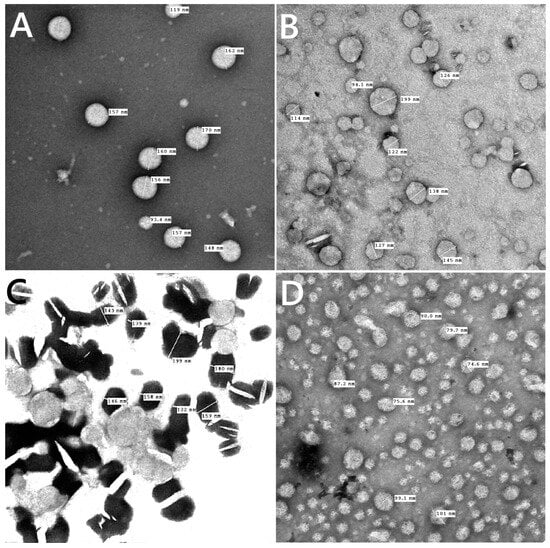 For every prepared liposomal suspension, the percent of entrapment efficiency was found to be greater than 90% when the drug was combined with lipid powder and then dissolved in ethanol. TEM images showed that, as shown in Figure 4A–D, all of the liposomes made in this work had an almost spherical shape, were evenly distributed, and had less aggregates for β-carotene vesicles that were empty or encapsulated. TEM findings showed that β-carotene was physically associated with causing liposomes’ surface membrane packing to be disrupted (Figure 4C). The presence of β-carotene in liposomes may induce stronger interactions via hydrogen bonding with the liposome lipid bilayer. The presence of β-carotene in liposomes enlarged the distance between adjacent bilayers, leading to liposomes that were bigger than the controls. Stronger drug interactions with the liposome lipid bilayer via hydrogen bonds may be the cause of the boost in particle size. These results could be explained by the nonpolar beta-carotene’s random distribution throughout the lipid bilayer, which has no preferred orientation [28]. This gives the alkyl hydrocarbon chains more mobility, which could account for the size increase. The possibility of inserting β-carotene in the hydrophobic part of the bilayer is supported, and these results are consistent with the data from the FTIR and DSC analyses.
