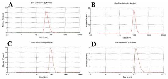 Liposome size distribution measured by dynamic light scattering (DLS) for (A) empty soy lecithin liposomal sample, (B) tamoxifen-encapsulated liposomes, (C) β-carotene-encapsulated liposomes, and (D) tamoxifen combined with beta-carotene into liposomes.