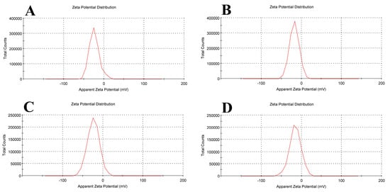 Zeta potential for (A) empty soy lecithin liposomal sample, (B) tamoxifen-encapsulated liposomes, (C) β-carotene-encapsulated liposomes, and (D) tamoxifen combined with beta-carotene into liposomes.
