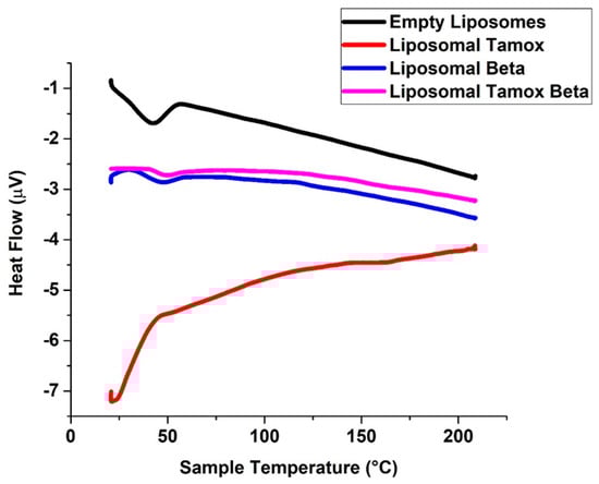 A substance in the soy lecithin membranes may have an impact on the vesicle transition’s thermo-tropic characteristics. When β-carotene or β-carotene combined with tamoxifen was incorporated into soy lecithin liposomes, the main endothermic peak (Tm) of empty soy lecithin, which was present at 41.6 °C, significantly shifted to a higher temperature at 44 °C and 47 °C, respectively. This indicates that the β-carotene or β-carotene combined with tamoxifen had a significant effect on the acyl chains of soy lecithin bilayers, establishing a conformational order inside the phospholipids and increasing the cooperative transition of lipid acyl chains [38,39]. Figure 7 shows that the formation of tight and ordered acyl chains is more favorable when β-carotene or β-carotene combined with tamoxifen is incorporated. This is indicated by the increased temperature of vacant soy lecithin’s main endothermic peak (Tm).