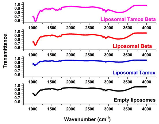 FTIR spectroscopy was used to examine the wavenumber of various functional groups, taking into account the acyl chains and the lipid molecule head group region in the presence or absence of foreign compounds, to analyze potential changes in the DSPC structure. The FTIR spectra of empty soy lecithin liposomes are displayed (Figure 8) and are compared with samples of soy lecithin liposomes and tamoxifen, β-carotene, or both in the 4000–400 cm−1 region.