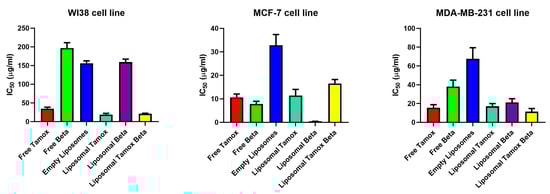 IC50 values for breast carcinoma cell lines (WI38, MCF-7, and MDA-MB-231) after 48 h exposure to various treatments: free tamoxifen, free β-carotene, empty liposomes, tamoxifen-loaded liposomes, β-carotene-loaded liposomes, and combination of tamoxifen/β-carotene-loaded liposomes. Determined by MTT assay.