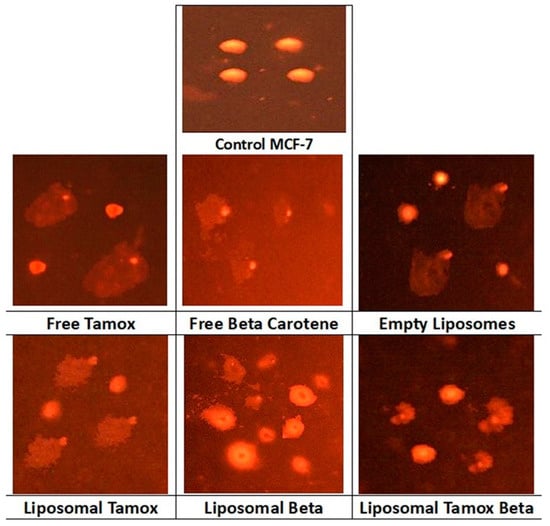 Comet assay images of MCF-7 cell line (evaluation of DNA damage induced by free tamoxifen, free β-carotene, empty liposomes, and liposomes doped with either tamoxifen, β-carotene, or tamoxifen combined with β-carotene compared to control MCF-7).