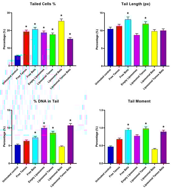 For the MCF-7 control cell line, Figure 11 shows the comet assay variables (tail length, tail moment, percent of tail cells, and percentage of tail DNA) and post-treatment with empty liposomes, free tamoxifen, free β-carotene, and liposomes coupled with either tamoxifen, β-carotene, or tamoxifen combined with beta-carotene separately, as opposed to the control group, as well as the differences between the control and post-treatment groups. The findings demonstrated that all comet assay variables were considerably (p < 0.05) higher for the liposomal β-carotene group than for the control values.