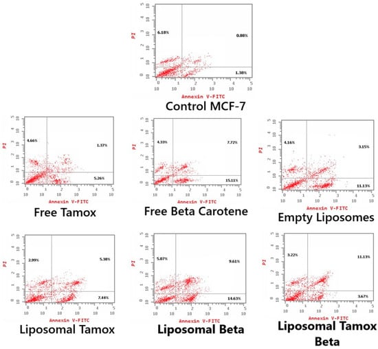 Representative flow cytometric analysis of MCF-7 cells: Control MCF-7, treated with the IC50 concentration of free tamoxifen, free β-carotene, empty liposomes, and liposomes doped with either tamoxifen, β-carotene, or tamoxifen combined with β-carotene for 48 h. The PI axes scale is reported as linear, and the Annexin V-FITC axes scale is reported as logarithmic.