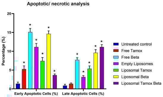 Results from MCF-7 cells: Control MCF-7, treated with the IC50 concentration of free tamoxifen, free β-carotene, empty liposomes, and liposomes doped with either tamoxifen, β-carotene, or tamoxifen combined with β-carotene for 48 h are expressed as a percentage of the total population. Data are reported as mean ± standard error from three independent experiments. Statistical analysis was performed by unpaired t-test to evaluate continuous variable differences between two groups. * p-values ≤ 0.05 were considered significant.