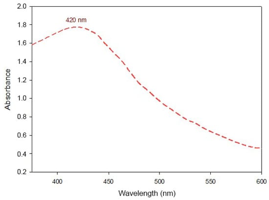 The surface plasmon resonance (SPR) of AgChNPs was characterized using UV-vis spectroscopy, which revealed a maximum absorption peak at 420 nm (Figure 1). This peak corresponds to the excitation of characteristic surface plasmon resonance vibrations of AgNPs, confirming the successful biosynthesis of AgChNP nanocomposites [30]. These findings align with those reported by Cortés et al. [31], who also reported SPR peaks at 420 nm in AgChNPs biosynthesized from Aloe barbadensis (Asparagales: Asphodelaceae), further validating the synthesis process. Additionally, Wulandari et al. [26] reported that SPR peaks within the 410–450 nm range are typically associated with nanoparticles of spherical morphology, as demonstrated in their study on AgChNPs biosynthesized from Musa paradisiaca (Zingiberales: Musaceae).
