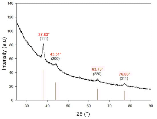 The crystalline nature of the nanoparticles was determined through XRD analysis. The XRD patterns exhibited intense peaks corresponding to Bragg reflections at 2θ = 37.83, 43.51, 63.73, and 76.86 (Figure 3), which are associated with the crystal facets of (111), (200), (220), (311) of the face-centered cubic structure of metallic Ag. The sharp appearance of these peaks confirmed the crystalline structure of the AgNPs, while the broad nature of the XRD peaks indicated the nanoscale size of the particles [34,35].