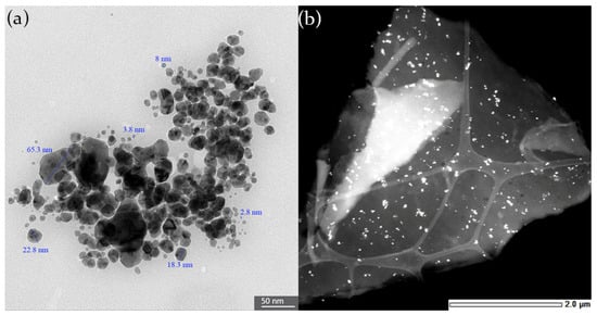 TEM analysis confirmed that both AgNPs and AgChNPs exhibited polydispersity, with spherical structures ranging in size from 2.8 to 65.3 nm (Figure 4a,b). This contrasts with the DLS results, which indicate a hydrodynamic diameter of 257.2 nm in solution, highlighting the tendency of nanoparticles to aggregate or form larger complexes in solution. Similar characteristics were reported by Seekonda and Rani [36], who observed AgNPs with an irregular spherical shape of varying sizes biosynthesized using Embelia robusta (Ericales: Primulaceae) extract. These findings are consistent with other studies that obtained AgNPs via biosynthesis using aqueous extracts from various terrestrial plants [37,38]. For instance, AgNPs produced from Baugainvillea glabra (Caryophyllales: Nyctaginaceae) exhibited a size range of 8–90 nm [39].