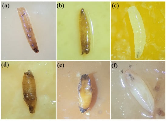 Drosophila suzukii individuals subjected to treatment with biosynthesized AgChNPs at 1000 ppm. (a,b) 2nd-instar larvae after treatment with biosynthesized AgChNPs. (c) Untreated healthy larvae. (d,e) Pupae after treatment with biosynthesized AgChNPs. (f) Untreated healthy pupae.