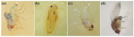 Furthermore, 71.7% of the emerged flies exhibited significant sublethal effects. Among these, malformations were observed in 62.8% of individuals, while demelanization occurred in 37.2% of affected flies (Table 2). Statistical analyses revealed significant differences between the proportions of malformations and demelanization (Chi-squared test: χ2 = 7.99, p = 0.0047). Sublethal effects primarily included morphological abnormalities such as exoskeletal deformities, malformed wings, incomplete emergence from the pupal stage, a dehydrated appearance, and white cuticle coloration (Figure 6).