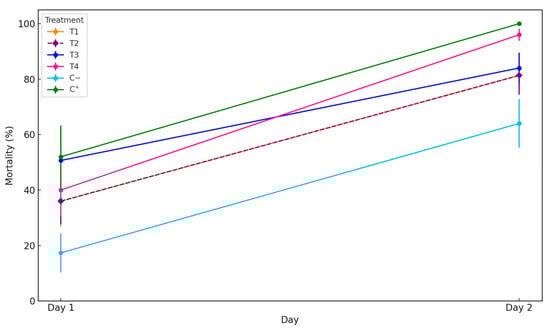 Larval mortality was assessed every 48 h over a 26-day period. The percentage mortality was calculated using Abbott’s formula [29]: