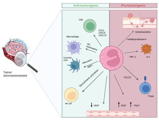 Some cytokines released by tumor cells can activate eosinophils, causing an increase in cervical carcinoma. The increased secretion of CCL17, induced by hypoxic conditions, attracted more eosinophils in the TME and led to a high level of immunosuppressant cytokines. Tumor-generated thymic stromal lymphopoietin is also involved in angiogenesis [].