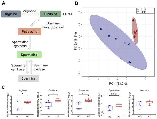 Arginine pathway metabolites are increased in idiopathic pulmonary fibrosis (IPF) patient saliva samples. (A) Diagram representing the arginine–polyamine metabolic pathway. (B) Principal component analysis (PCA) score plot between the main principal components (PC1 and PC2) shows a tight cluster of the IPF samples based on their metabolic profile compared to controls, with a 95% confidence ellipse drawn for each group (shown by the dotted lines). Assessment of PC1 and PC2, which account for 76.4% of the total variation between the control (HC) and IPF clusters, highlights the prominence of polyamines. (C) Associated box and whisker plots of metabolites in the arginine–polyamine pathway highlight the differences between healthy and IPF profiles. Y-axis: Log10 normalization of metabolite intensity. Statistical analysis was performed with unpaired two-tailed Student t-test; * p < 0.05, ** p < 0.01. N = 6 controls; 6 IPF patients.