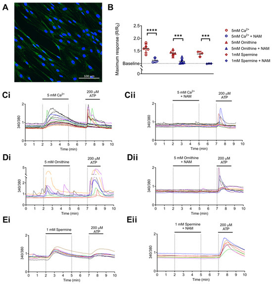 As seen in Figure 2Di,Ei, both 5 mM ornithine (basic amino acid; Figure 2Di) and 1 mM spermine (polyamine; Figure 2Ei) evoked a significant rise in [Ca2+]i from baseline, effects that were again abolished in the presence of NAM (NPS2143, 1 µM; p = 0.0001 and p = 0.0005, respectively; Figure 2B,Dii,Eii). These results are consistent with the hypotheses that NHLFs express functional CaSR, which can be activated by arginine pathway metabolites, and this effect is abolished by the CaSR NAM, NPS2143.