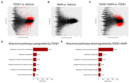 Enrichment analysis of differentially expressed genes (DEGs) from RNA sequencing (RNAseq) in primary human lung fibroblasts treated with vehicle (0.01% DMSO), CaSR NAM (1 μM NPS2143), TGFβ1 (5 ng/mL), and TGFβ1+ CaSR NAM for 72 h. The MA plots show the log2-fold change between experimental groups (M) against the mean expression across all the samples (A) for each gene. Statistically significant differentially expressed genes (DEGs) for each comparison are shown in red. The x-axis shows the mean of normalized gene counts; the y-axis shows log2 fold-changes in expression (positive values represent upregulated genes, while negative values denote downregulation). (A) MA plot of RNAseq showing the DEGs in TGFβ1 treated cells relative to unstimulated cells (vehicle control) cells. Red dots represent statistically significant DEGs (Down-DEGs: 1999; Up-DEGs: 2757), while black dots represent non-significantly altered genes. (B) No significant difference in gene expression was observed when the CaSR NAM-treated cells were compared with vehicle control cells. (C) MA plot showing the DEGs in cells co-treated with TGFβ1 + CaSR NAM relative to TGFβ1-treated cells. Red dots represent statistically significant DEGs (Down-DEG: 2608; Up-DEG: 2150). (D,E) Annotation of key Reactome pathways based on the enrichment analysis of the statistically significant DEGs. (D) Key Reactome pathways upregulated by TGFβ1 relative to vehicle control. (E) Key Reactome pathways downregulated by CaSR NAM in the presence of the fibrotic stimulus, TGFβ1, relative to TGFβ1 treatment alone. Benjamini–Hochberg p-value adjustment was performed for all statistical tests; level of controlled false positive rate was set to 0.05. * p < 0.05, **** p < 0.0001. N = 3 donors. NAM: Calcium-sensing receptor (CaSR) Negative Allosteric Modulator treatment; TGFβ1: Transforming growth factor β1 (TGFβ1) treatment; TGFβ1 + NAM: TGFβ1 and CaSR Negative Allosteric Modulator co-treatment.