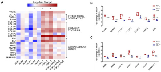 TGFβ1 treatment significantly differentially expressed 4756 genes compared to unstimulated fibroblasts (vehicle control), with 2757 genes upregulated and 1999 genes downregulated (Figure 3A). Treating the fibroblasts with NAM alone did not induce any significant changes in gene expression (Figure 3B). Co-treating NHLFs with TGFβ1 and NAM significantly upregulated 2150 genes whilst downregulating 2608 genes when compared to TGFβ1-treated fibroblasts (Figure 3C).
