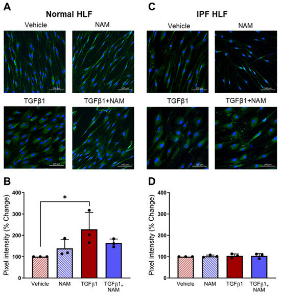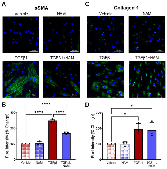 We also assessed the expression of pro-fibrotic markers implicated in IPF. TGFβ1 treatment increased αSMA expression (p < 0.0001) and collagen expression (p = 0.03), compared with vehicle control (Figure 8). CaSR NAM co-treatment reduced αSMA protein expression (p < 0.0001; Figure 8A,B). While CaSR NAM treatment did not reduce total collagen expression, it altered its expression pattern from diffuse to concentrated (Figure 8C,D) and modified the morphology of the cells from large and extended (associated with more secretory and contractile functions) to smaller, spindle-shaped morphology, typical of inactive fibroblasts [61] (Figure S7).