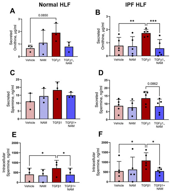 Exogenous treatment of NHLFs and IPF HLFs with TGFβ1 induced ornithine secretion; CaSR NAM co-treatment reduced ornithine secretion in IPF fibroblasts by 65% (p = 0.0003) (Figure 7A,B). Due to the low concentration of spermine secreted in all treatment conditions (Figure 7C,D), we investigated the intracellular concentration of spermine in normal and IPF HLFs. TGFβ1 increased spermine concentration in both normal and diseased fibroblasts (p < 0.05). In both circumstances, co-treatment with CaSR NAM restored baseline levels of spermine (p < 0.05; Figure 7E,F).
