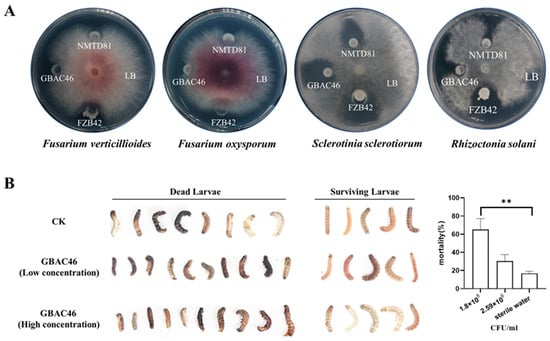 Determination and evaluation of GBAC46 strain biocontrol activity against plant pathogenic fungi and phytophagous pests. (A) Antifungal activity of bacterial cultures against several plant pathogenic fungi in the potato dextrose agar (PDA) medium. (B) Morphological differences and mortality rate of Spodoptera frugiperda larvae treated with GBAC46 strain. The phenotypic experiments were conducted in triplicate, yielding consistent results. Asterisks (**) indicate significant differences in the data.