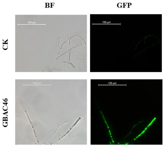The impact of GBAC46’s culture supernatant on the burst and accumulation of ROS in fungal hyphae was detected using a DCFH-DA kit. The result showed that stronger green fluorescence was observed in hyphae treated with GBAC46’s culture supernatant compared to the negative control (Figure 2), indicating a large accumulation of ROS in the fungal mycelium.