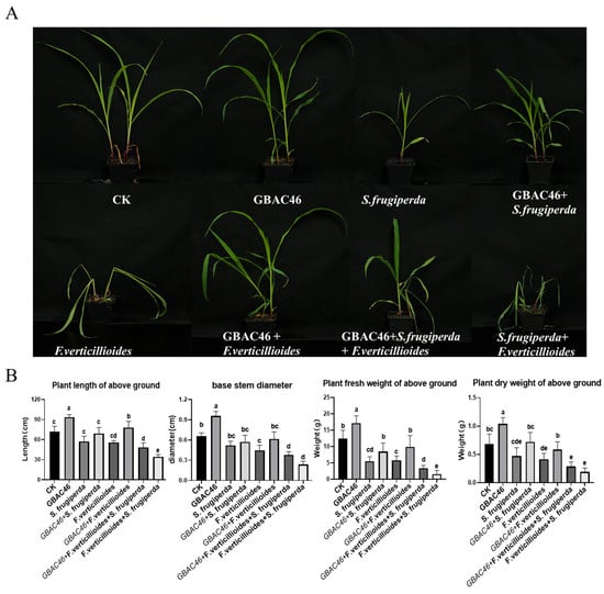 Evaluating the biocontrol activity of the GBAC46 strain against single and co-occurring diseases and pests caused by F. verticillioides and S. frugiperda and the effect of feeding by S. frugiperda on infection of F. verticillioides through pot experiments. (A) The growth rate of maize seedlings aboveground in different treatments. (B) Data collection and statistical analysis of plant height, plant fresh weight, plant dry weight, and base stem diameter of maize seedlings under varying treatments. The error bars on the graphs indicate the standard deviation of the mean (n = 10). The letters above the columns represent significant differences between treatments at p ≤ 0.05.