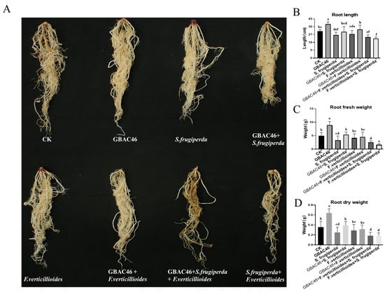 Testing the biocontrol activity of GBAC46 strain against F. verticillioides and S. frugiperda through maize root growth traits. (A) The growth status of maize roots in different treatments. (B–D) Data collection and statistical analysis of root length, root fresh weight, and root dry weight. The error bars on the graphs indicate the standard deviation of the mean (n = 10). The letters above the columns represent significant differences between treatments at p ≤ 0.05.