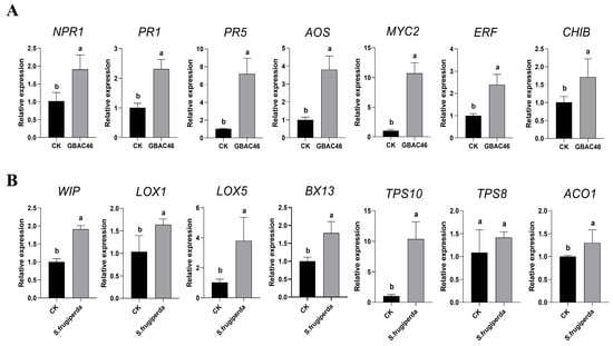 Profiling the expression levels of related genes in maize seedling systemic resistance response induced by GBAC46 strain and the feeding by S. frugiperda by RT-qPCR experiments. (A) The key genes NPR1, PR1, and PR5 involved in the salicylic acid pathway, AOS and MYC2 involved in the jasmonic acid pathway, and ERF and CHIB involved in the ethylene signaling pathway were selected to detect maize seedling systemic resistance response induced by the GBAC46 strain. (B) The key genes LOX1, LOX5, BX13, TPS8, TPS10, and ACO1 related to primary and secondary metabolism and mechanical injury-induced protein (WIP) genes in maize were chosen to test maize seedling systemic resistance response induced by S. frugiperda. The error bars on the graphs indicate the standard deviation of the mean (n = 3). The letters above the columns represent significant differences between treatments at p ≤ 0.05.