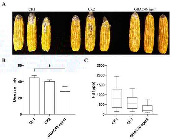 To further assess the biocontrol potential of the GBAC46 strain against maize seedling blight, a field experiment was conducted. The disease incidence in maize cobs was graded and quantified, revealing that the CK1 group (untreated control) exhibited the highest disease index at 44.9 ± 2.1 %. In the CK2 group (treated with pesticides), the disease index was slightly lower at 40.3 ± 1.5% (Figure 6A). In contrast, maize affected by seedling blight and treated with the GBAC46 strain showed a significantly reduced disease index of 28.1 ± 4.7% (Figure 6B). Based on these results, the relative control efficacy of GBAC46 against maize seedling blight was determined at 37.4% compared to the CK1 treatment. Additionally, the fumonisin B1 content in maize grains from different treatments was analyzed. The grain treated with GBAC46 has a significantly lower fumonisins B1 content of 294.9 ± 25.9 ppb compared to the CK1 and CK2 groups (Figure 6C).