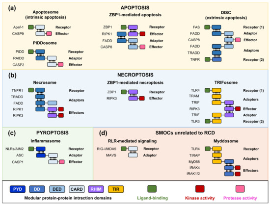 Simplified scheme of interactions mediated by typical modular domains that govern the assembly of key SMOCs in innate immunity and RCD. Signalosomes operating in apoptotic (a), necroptotic (b), and pyroptotic (c) cell death, together with innate immunity signaling complexes that show a similar architecture (d). Only single heterotypic interactions of core signalosomes are represented.
