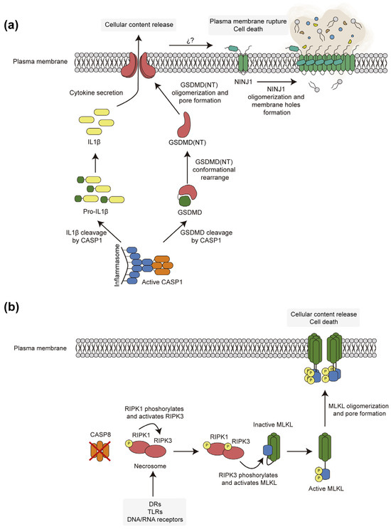 Schematic representation of pyroptotic (a) and necroptotic (b) pathways. (a) In pyroptotic RCD, inflammasome-mediated activation of caspase-1 (CASP1) leads to processing of both pro-IL-1β and GDSMD. The latter releases its N-terminal domains (NT) to assemble pores that facilitate the release of processed pro-inflammatory IL-1β and causes membrane integrity and ion permeability changes that eventually trigger NINJ1 polymerization to promote dramatic plasma membrane rupture. (b) In the absence of caspase-8 (CASP8) activity, RIPK kinases respond to death receptors (DRs) or other stimuli to promote the activation of the MLKL pore as a consequence of conformational changes induced by interaction and phosphorylation. These pores destabilize membrane homeostasis to cause necroptosis but do not seem to stimulate NINJ1-mediated plasma membrane rupture.
