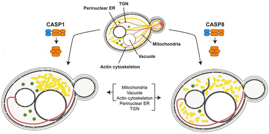 Effects on yeast organelles as a consequence of human caspase-1 (CASP1) and caspase-8 (CASP8) expression [99]. Both caspases were able to auto-activate in the yeast cell, leading to diverse observable effects in organelle size and distribution, as well as in the actin cytoskeleton, ultimately causing severe toxicity. The alteration of the endoplasmic reticulum (ER) and Golgi (TGN, trans Golgi network) were only observed for caspase-8.