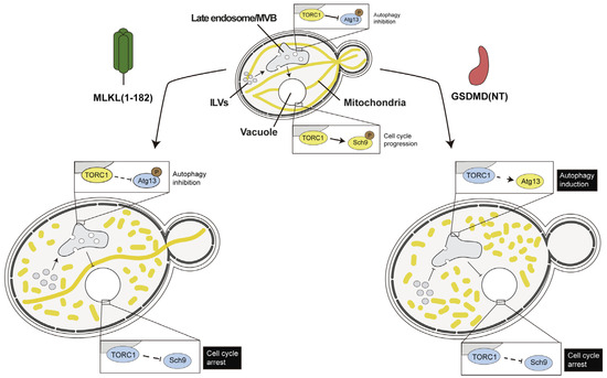 Effects of MLKL and GSDMD pore-forming fragments in yeast. The phenotypes observed upon heterologous expression of truncated MLKL (1-182) and GSDMD (NT) were very similar, involving mitochondrial fragmentation and the disruption of endocytosis. These effects led to TORC1 inhibition and cell cycle arrest. TORC1 kinase downregulation was evidenced by altered phosphorylation of its target, the Sch9 protein kinase and, in the case of GSDMD (NT), Atg13, involved in autophagy. However, TORC1 inhibition did not lead in any case to the expected triggering of autophagy, likely due to GSDMD (NT) and MLKL interference with trafficking events downstream. All observed effects were more severe in GSDMD (NT) than in full-length or truncated MLKL. Remarkably, GSDMD (NT) inhibited endocytosis at the stage of formation of multivesicular bodies, whereas MLKL blocked the fusion of late endosomes with the vacuole (equivalent to lysosomes in higher cells) [106]. MVB, multivesicular bodies; ILV, intraluminal vesicles.