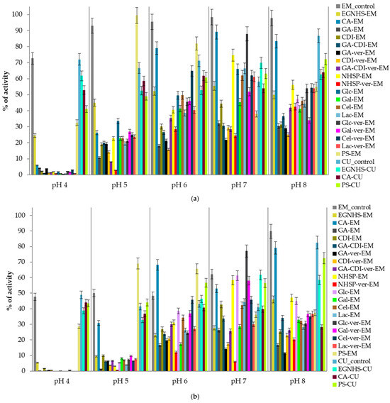 pH stability of E. meliloti L3.8 and C. unicolor C-139 laccases measured at the 15th (a) and 30th days (b) of the experiment; data are mean ± SD for three measurements (n = 3); the activity measured for each modified enzyme on day zero is considered to be 100% activity.