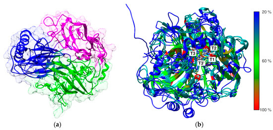 Predicted structure of E. meliloti L3.8 laccase. The recognized domain A is colored blue, domain B is colored purple, and domain C is colored dark green. The domain ranges were assigned according to SWORD2 partition algorithm analysis results [54] (a). The superimposition of the 3D structures of fungal and bacterial laccases from the resources of the Protein Data Bank and predicted structures of E. meliloti L3.8 and C. unicolor C-139 laccases with the highlighted probable localization of the three copper centers. Protein models are colored in rainbow scale to indicate the percent sequence similarity/identity calculated from multiple alignment (Figure 3) (b).