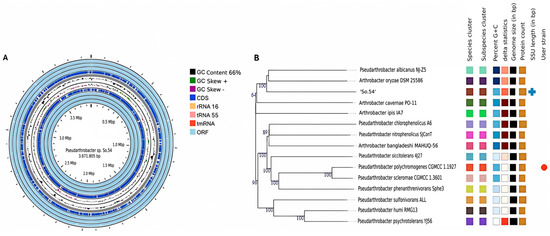 (A) Genome circle map of strain Pseudarthrobacter sp. So.54. GC content (black), GC skew curves (+/−, green/purple), coding sequences (CDSs, dark blue), rRNAs (light orange), tRNAs (pink), tmRNAs (vermilion), and open reading frames (ORFs, light blue); (B) Phylogenetic tree was constructed based on the whole genome using the Genome-BLAST distance phylogenetic method (GBDP) tool. According to the GBDP distance formula d5, the branch lengths were scaled.