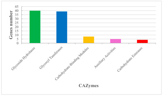 CAZy annotation classification distribution map. The horizontal axis is the CAZy category, and the vertical axis is the number of genes annotated by the corresponding category.