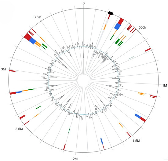 - Grant, J.R.; Enns, E.; Marinier, E.; Mandal, A.; Herman, E.K.; Chen, C.Y.; Graham, M.; Van Domselaar, G.; Stothard, P. Proksee: In-depth characterization and visualization of bacterial genomes. Nucleic Acids Res. 2023, 51, W484–W492. [Google Scholar] [CrossRef] [PubMed]