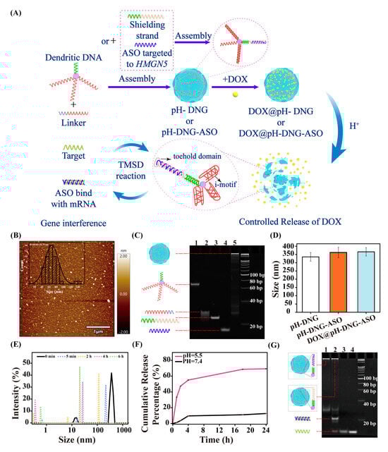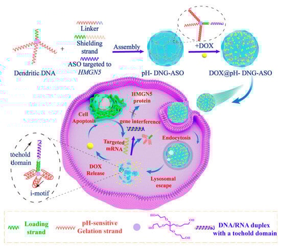 Consequently, there is an urgent need to develop DNA nanohydrogels that incorporate these responsive features. DNA nanohydrogels exhibit remarkable programmability, allowing for the design of systems responsive to specific biological stimuli, such as pH, mRNA, or specific biomolecules within tumor microenvironment [18,19]. This responsiveness would pave the way for integrating chemotherapeutics with gene therapies [20,21], aligning a timely release of therapeutic agents with targeted genetic interventions. In this context, we have developed a pH/mRNA stimuli-responsive dendritic-DNA-based nanohydrogel (DOX@pH-DNG-ASO) for the co-delivery of doxorubicin (DOX) and antisense oligonucleotides (ASOs) to achieve combined therapeutic effects in vitro (Scheme 1). This multifunctional DNA nanohydrogel demonstrates significant anticancer activity through a combination approach of chemo–gene treatments, which involves silencing the tumor-associated gene HMGN5 [22,23].