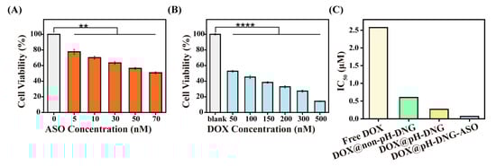 (A) Cell viability of MDA-MB-231 breast cancer cells after treatment with pH-DNG-ASO at different concentrations of ASOs for 48 h. (B) Cell viability of MDA-MB-231 treated with DOX@pH-DNG-ASO at different concentrations of DOX (the concentration of ASOs, 60 nM) for 48 h. (C) IC50 value of MDA-MB-231 treated with free DOX, DOX@non-pH-DNG, DOX@pH-DNG, and DOX@pH-DNG-ASO for 48 h. Asterisks represent significant differences and compared with blank control (** p < 0.01, **** p < 0.0001). Mean ± s.d., n = 3.