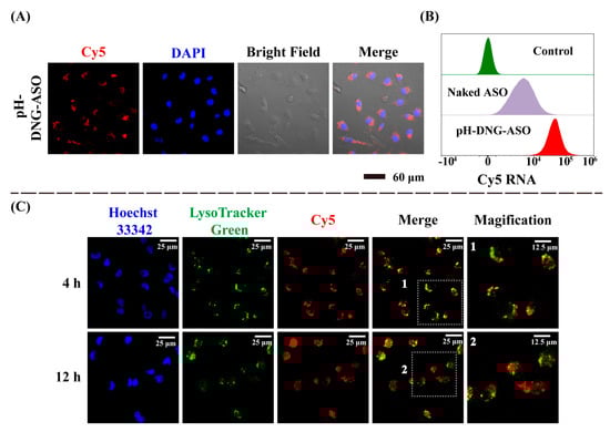 Cellular uptake and intracellular distribution of pH-DNG-ASO in MDA-MB-231 cells. (A) Confocal images of MDA-MB-231 cells after incubation with pH-DNG-ASO for 4 h. Cell nuclei were stained with DAPI (blue), and ASOs were labeled with Cy5 (red). (B) Flow cytometry analysis of cellular uptake of naked ASOs and pH-DNG-ASO (the concentration of ASOs, 60 nM) by MBA-MB-231 cells after incubation for 4 h. (C) Intracellular lysosomal escape of pH-DNG-ASO for 4 h, and 12 h. Cell nuclei were stained with Hoechst 33342 (blue), and lysosomes were labeled with Lysotracker Green (green).